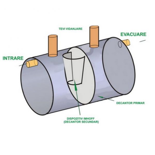 IMHOFF), in timp ce fluidul limpezit este evacuat in al treilea compartiment unde are loc o descompunere